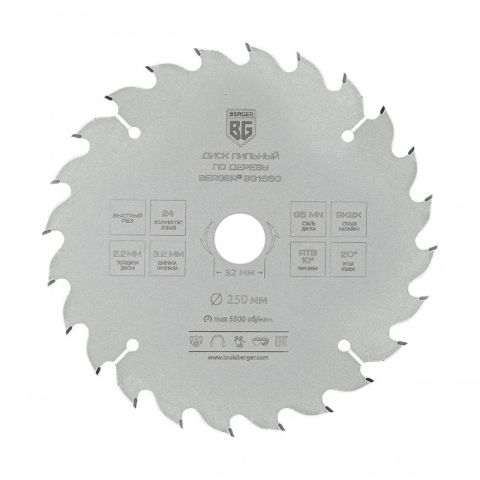 Диск пильный по дереву и ДСП, быстрый рез (250x32/30/25.4/20x24z, 3.2/2.2 мм, ATB 10°, атака 20°) BERGER BG1660