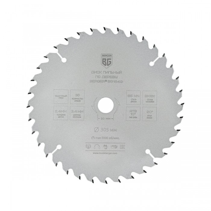 Диск пильный по дереву и ДСП, быстрый рез (305x30/25.4/20/16x36z, 3.4/2.4 мм, ATB 10°, атака 20°) BERGER BG1649