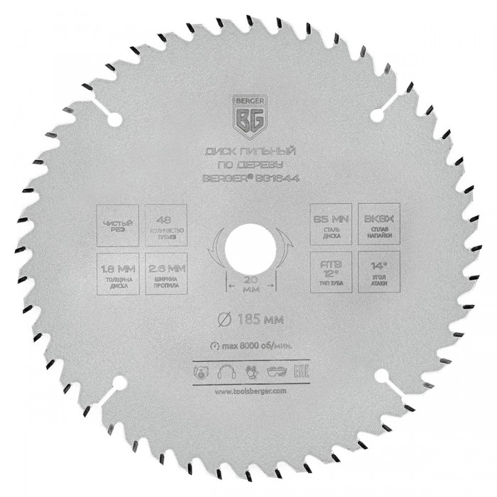 Диск пильный по дереву и ДСП, чистый рез (185x20/16x48z, 2.6/1.8 мм, ATB 12°, атака 14°) BERGER BG1644