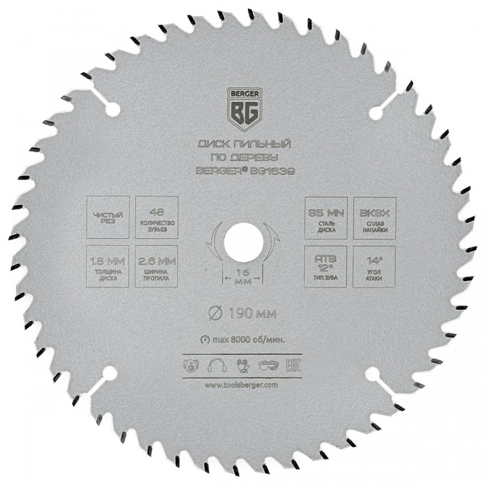 Диск пильный по дереву и ДСП, чистый рез (190x16x48z, 2.6/1.8 мм, ATB 12°, атака 14°) BERGER BG1639