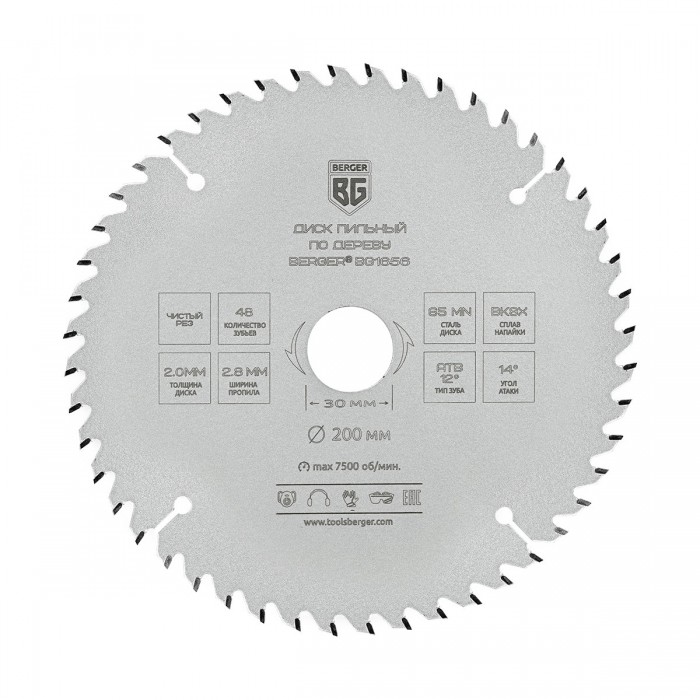 Диск пильный по дереву и ДСП, чистый рез (200x30/25.4/20/16x48z, 2.8/2.0 мм, ATB 12°, атака 14°) BERGER BG1656