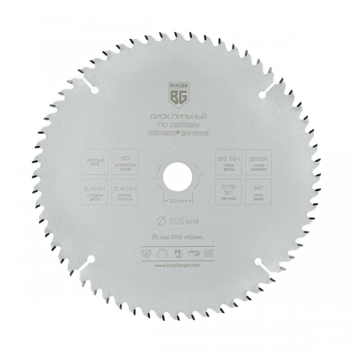 Диск пильный по дереву и ДСП, чистый рез (305x30/25.4/20/16x60z, 3.4/2.4 мм, ATB 12°, атака 14°) BERGER BG1658