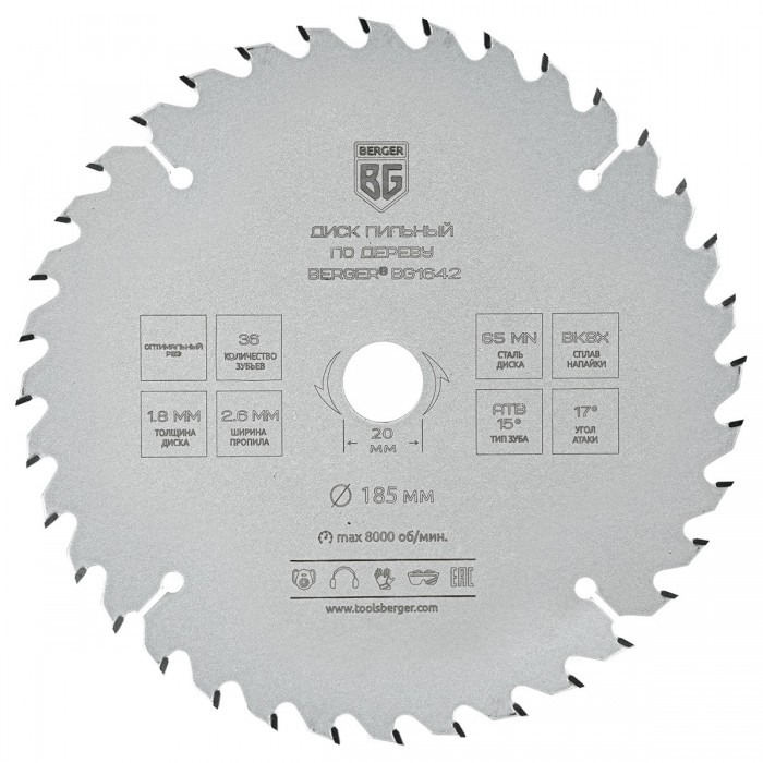 Диск пильный по дереву и ДСП, оптимальный рез (185x20/16x36z, 2.6/1.8 мм, ATB 15°, атака 17°) BERGER BG1642