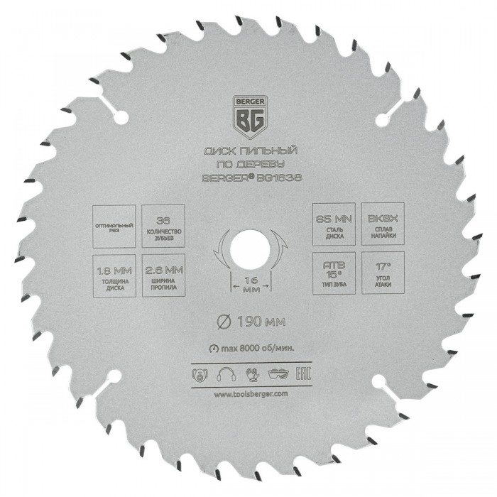 Диск пильный по дереву и ДСП, оптимальный рез (190x16x36z, 2.6/1.8 мм, ATB 15°, атака 17°) BERGER BG1638