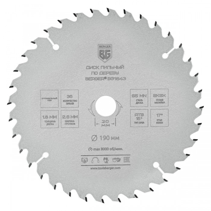 Диск пильный по дереву и ДСП, оптимальный рез (190x20/16x36z, 2.6/1.8 мм, ATB 15°, атака 17°) BERGER BG1643