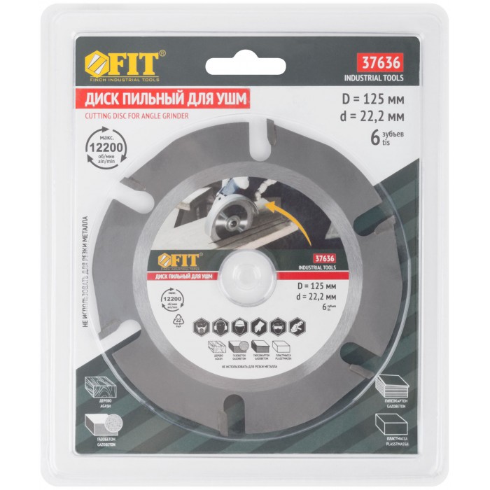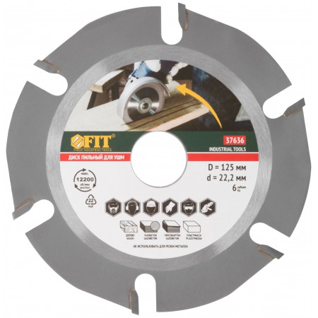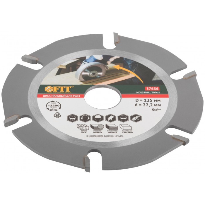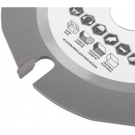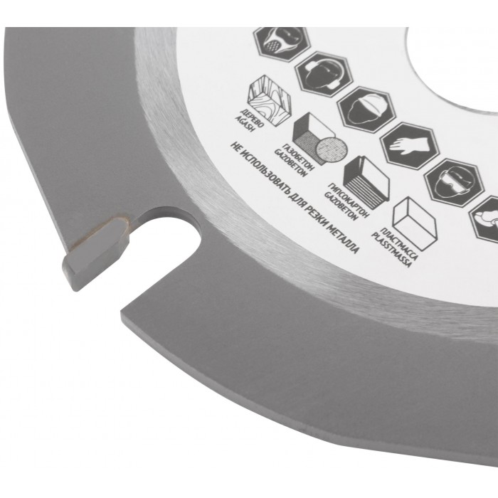 По дереву, газобетону, гипсокартону, пластмассе. Для углошлифовальных машин. Посадочный диаметр 22,2 мм. 6 зубьев с карбидными вставками. Чистый рез. Специальная форма диска толщиной 2,2 мм препятствует застреванию в материале. Материал: инструментальная сталь, зубья с карбидными вставками. Упаковка: блистер.
