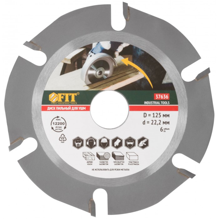 Диск пильный по дереву, посадочный диаметр 22,2 мм, 6 зубьев с карбидными вставками, 125 мм (37636)