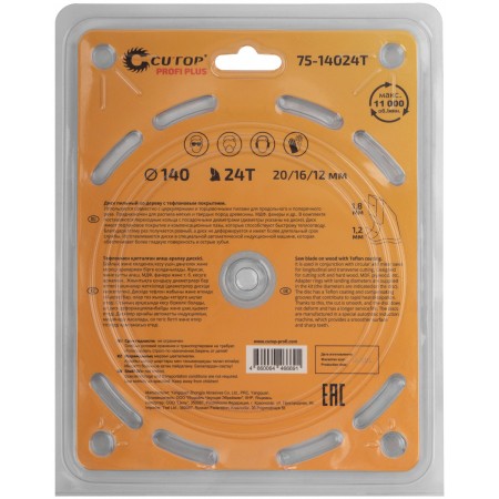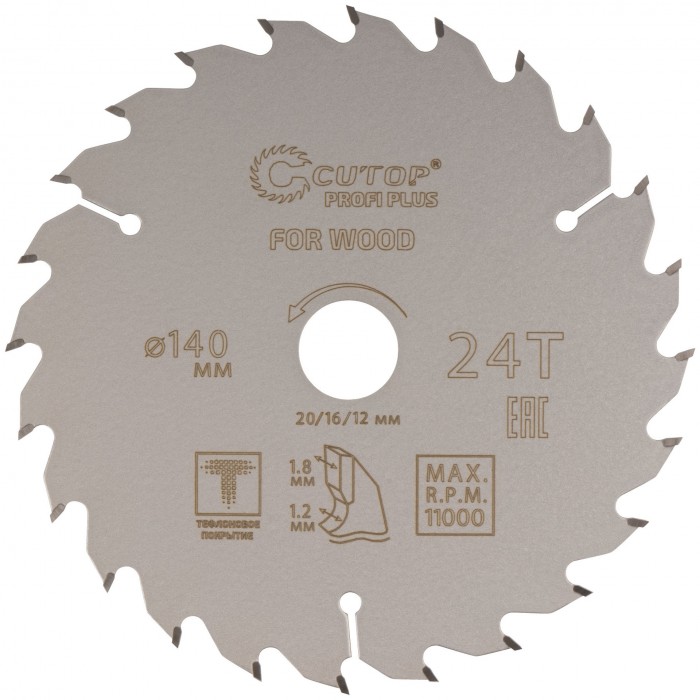 Диск пильный по дереву с тефлоновым покрытием 24Т, CUTOP Profi plus, 140 х 1,2/1,8 х 20/16/12 мм (75-14024Т)