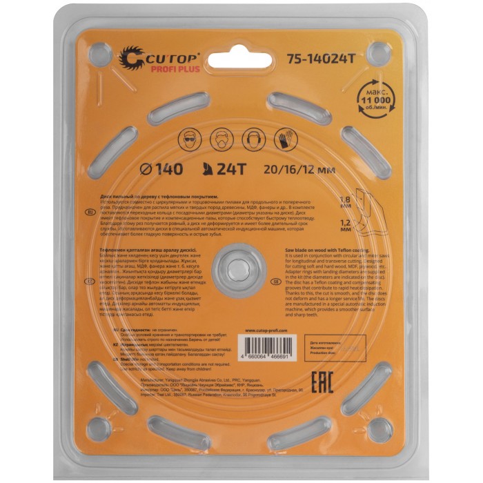 Диск имеет тефлоновое покрытие и компенсационные пазы, которы способствуют быстрому теплоотводу. Благодаря этому рез получается ровный, а диск не деформируется и имеет более длительный срок службы. Изготавливаются диски в специальной автоматической индукционной машине, которая обеспечивает более гладкую поверхность и острые зубья. Материал: инструментальная сталь, карбидные зубья. Упаковка: блистер.