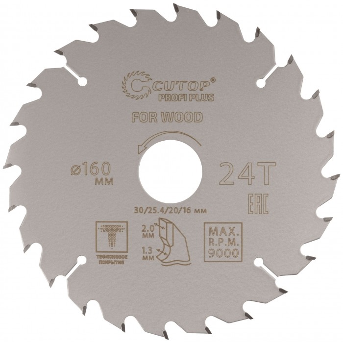 Диск пильный по дереву с тефлоновым покрытием 24Т, CUTOP Profi plus 160 х 1,3/2,0 х 30/25,4/20/16 мм (75-16024Т)