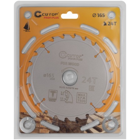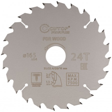 Диск пильный по дереву с тефлоновым покрытием 24Т, CUTOP Profi plus, 165 х 1,3/2,0 х 30/25,4/20/16 мм (75-16524Т)