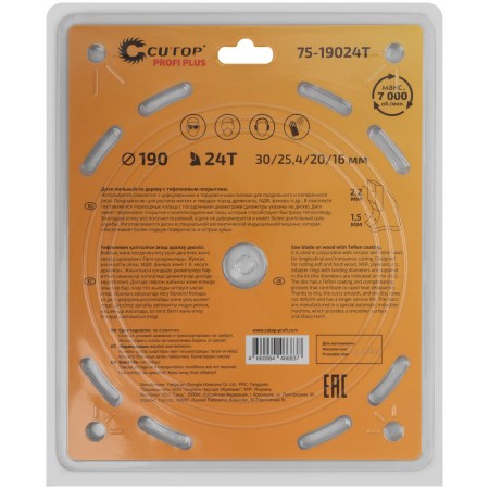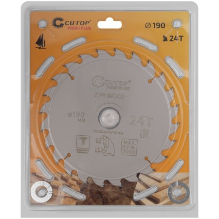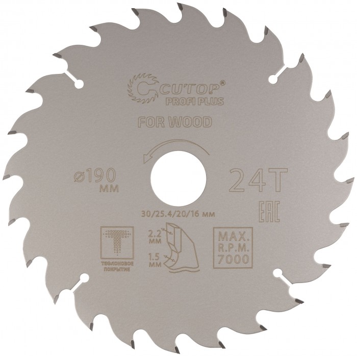 Диск пильный по дереву с тефлоновым покрытием 24Т, CUTOP Profi plus, 190 х 1,5/2,2 х 30/25,4/20/16 мм (75-19024Т)