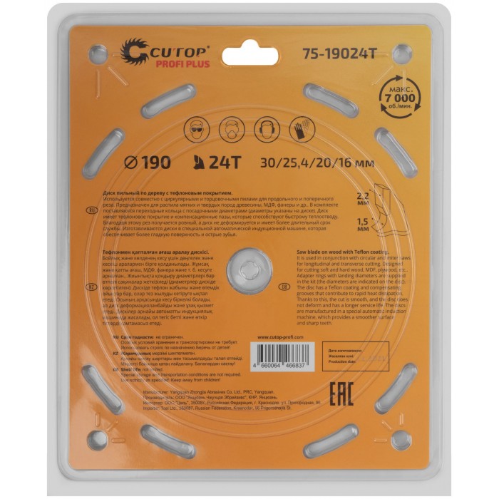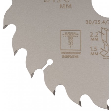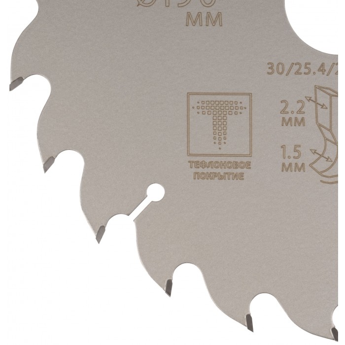 Диск имеет тефлоновое покрытие и компенсационные пазы, которы способствуют быстрому теплоотводу. Благодаря этому рез получается ровный, а диск не деформируется и имеет более длительный срок службы. Изготавливаются диски в специальной автоматической индукционной машине, которая обеспечивает более гладкую поверхность и острые зубья. Материал: инструментальная сталь, карбидные зубья. Упаковка: блистер.
