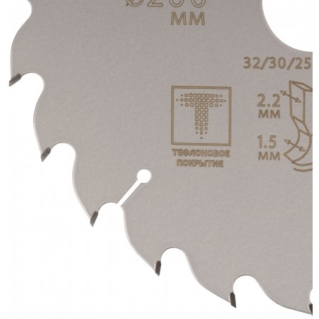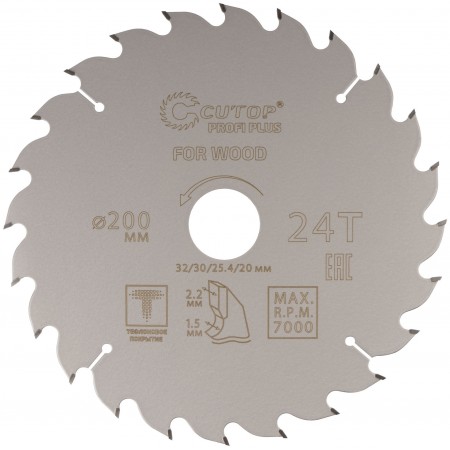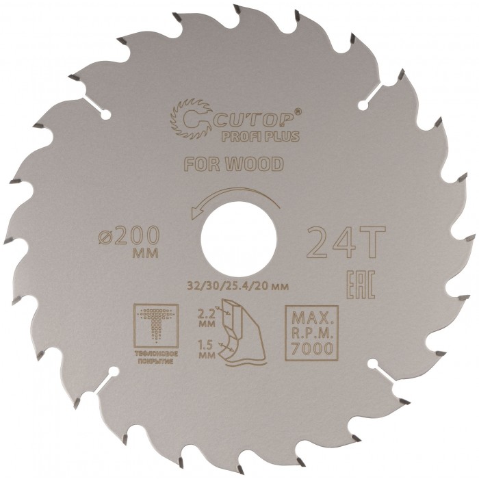 Диск пильный по дереву с тефлоновым покрытием 24Т, CUTOP Profi plus, 200 х 1,5/2,2 х 32/30/25,4/20 мм (75-20024Т)