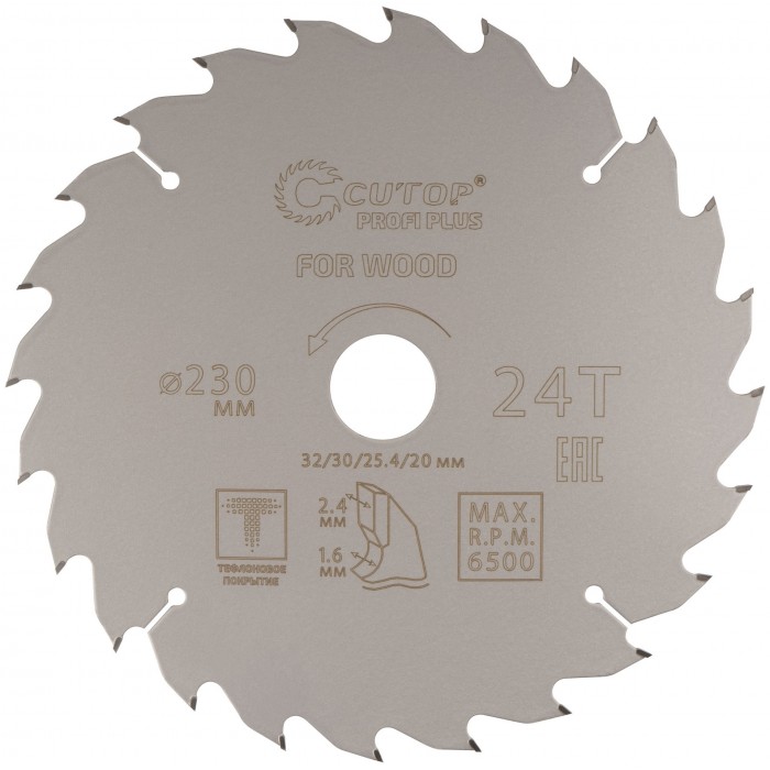 Диск пильный по дереву с тефлоновым покрытием 24Т, CUTOP Profi plus, 230 х 1,6/2,4 х 32/30/25,4/20 мм (75-23024Т)