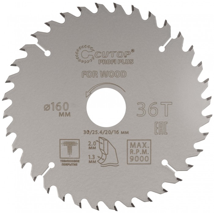 Диск пильный по дереву с тефлоновым покрытием 36Т, CUTOP Profi plus, 160 х 1,3/2,0 х 30/25,4/20/16 мм (75-16036Т)