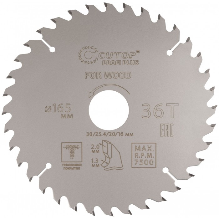 Диск пильный по дереву с тефлоновым покрытием 36Т, CUTOP Profi plus, 165 х 1,3/2,0 х 30/25,4/20/16 мм (75-16536Т)