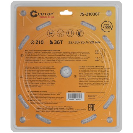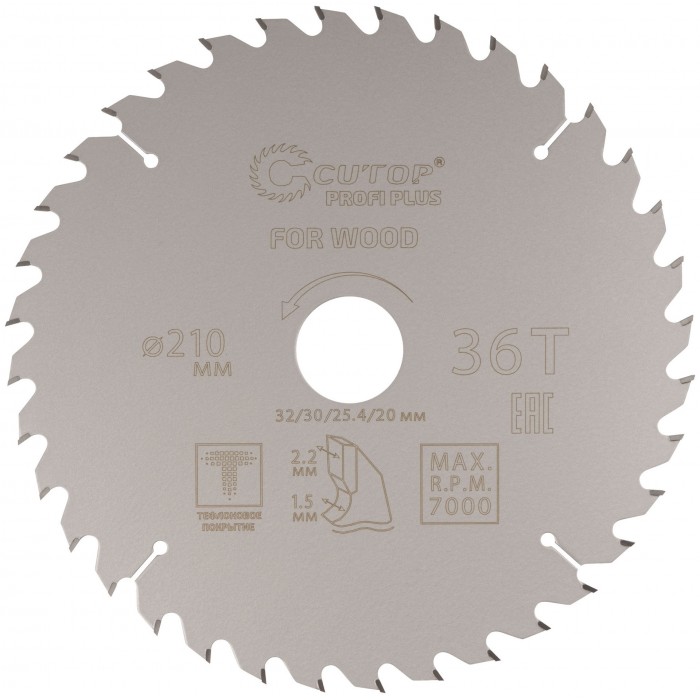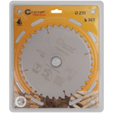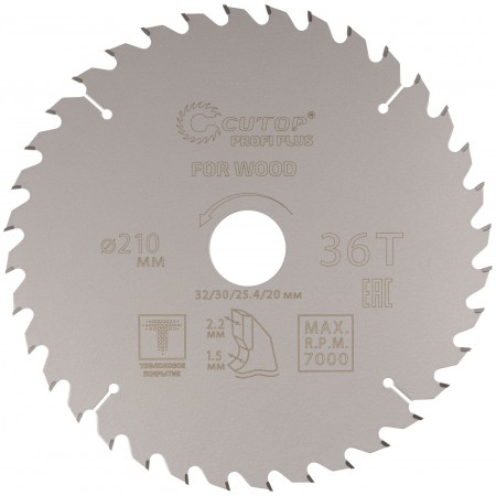 Диск пильный по дереву с тефлоновым покрытием 36Т, CUTOP Profi plus, 210 х 1,5/2,2 х 32/30/25,4/20 мм (75-21036Т)