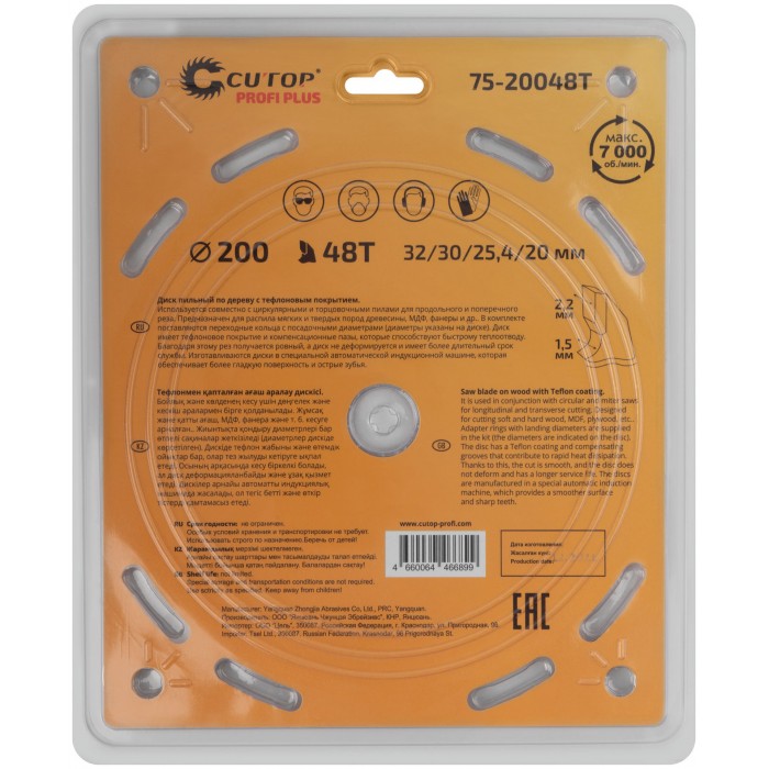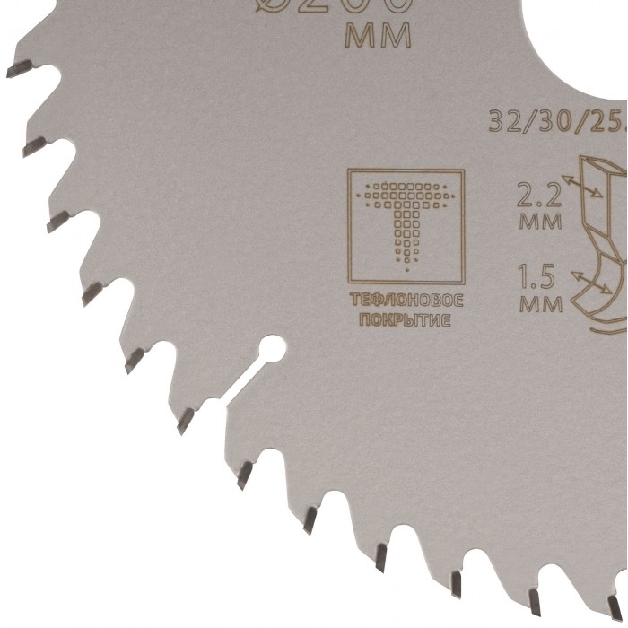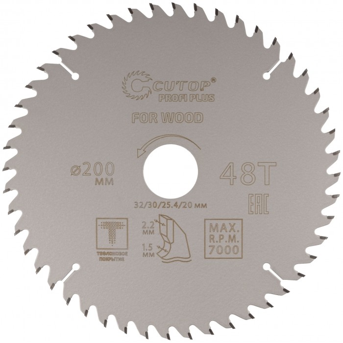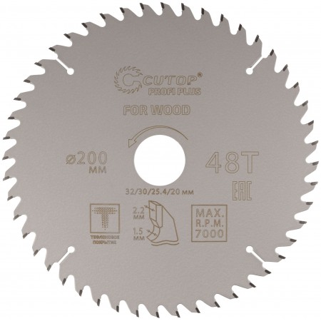 Диск пильный по дереву с тефлоновым покрытием 48Т, CUTOP Profi plus, 200 х 1,5/2,2 х 32/30/25,4/20 мм (75-20048Т)
