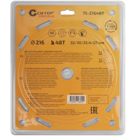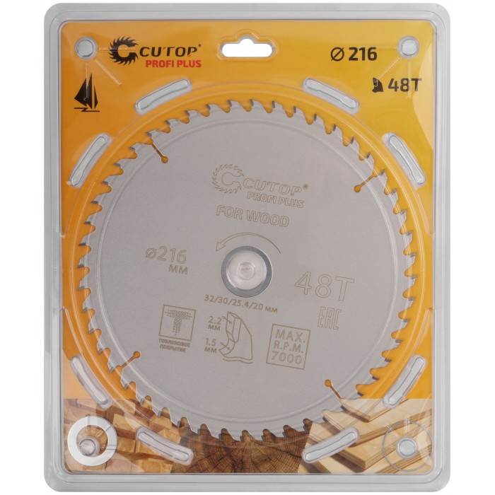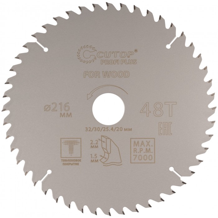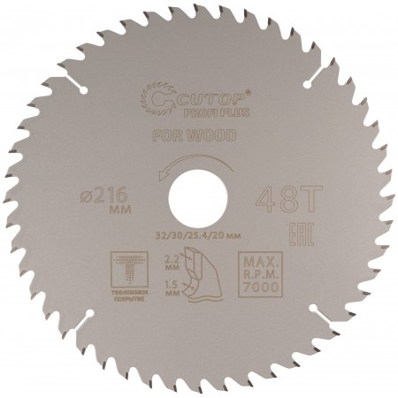 Диск пильный по дереву с тефлоновым покрытием 48Т, CUTOP Profi plus, 216 х 1,5/2,2 х 32/30/25,4/20 мм (75-21648Т)