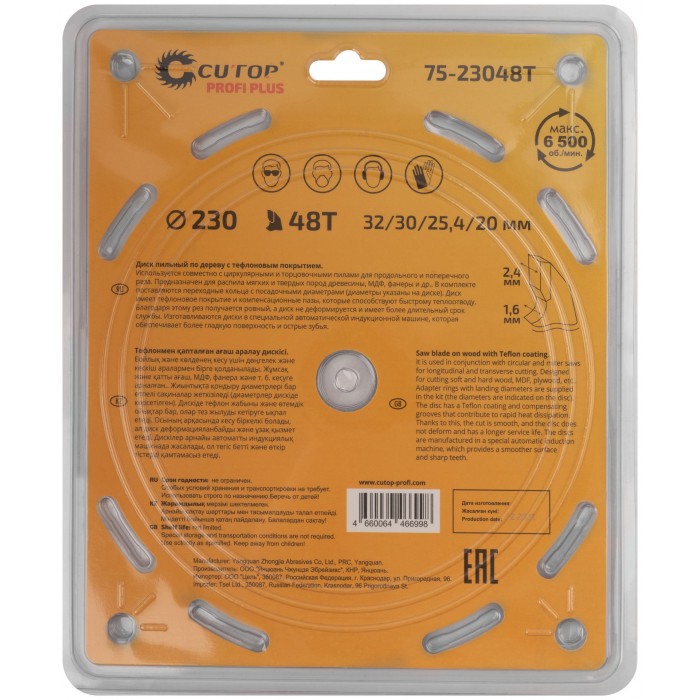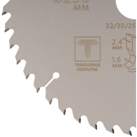Диск имеет тефлоновое покрытие и компенсационные пазы, которы способствуют быстрому теплоотводу. Благодаря этому рез получается ровный, а диск не деформируется и имеет более длительный срок службы. Изготавливаются диски в специальной автоматической индукционной машине, которая обеспечивает более гладкую поверхность и острые зубья. Материал: инструментальная сталь, карбидные зубья. Упаковка: блистер.