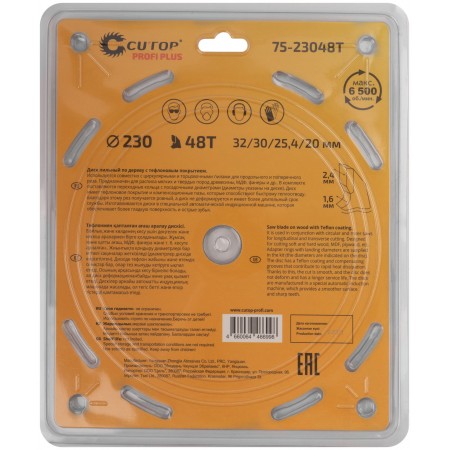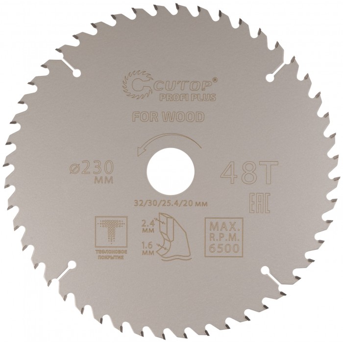 Диск пильный по дереву с тефлоновым покрытием 48Т, CUTOP Profi plus, 230 х 1,6/2,4 х 32/30/25,4/20 мм (75-23048Т)