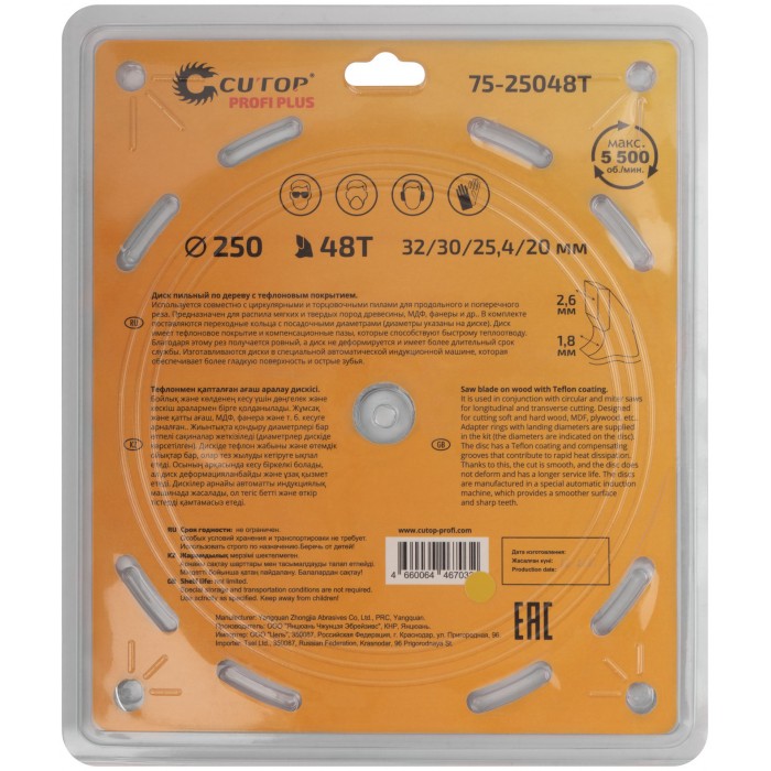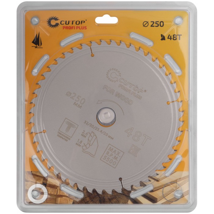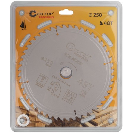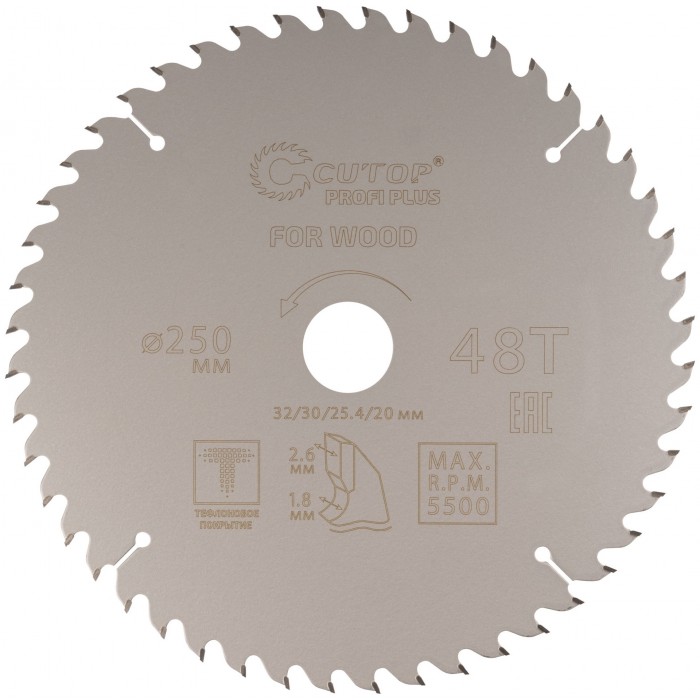 Диск пильный по дереву с тефлоновым покрытием 48Т, CUTOP Profi plus, 250 х 1,8/2,6 х 32/30/25,4/20 мм (75-25048Т)