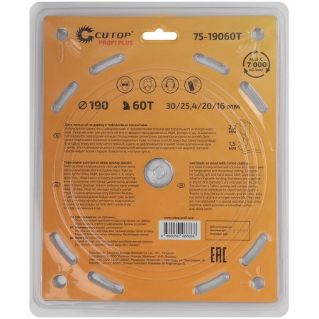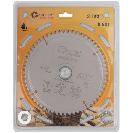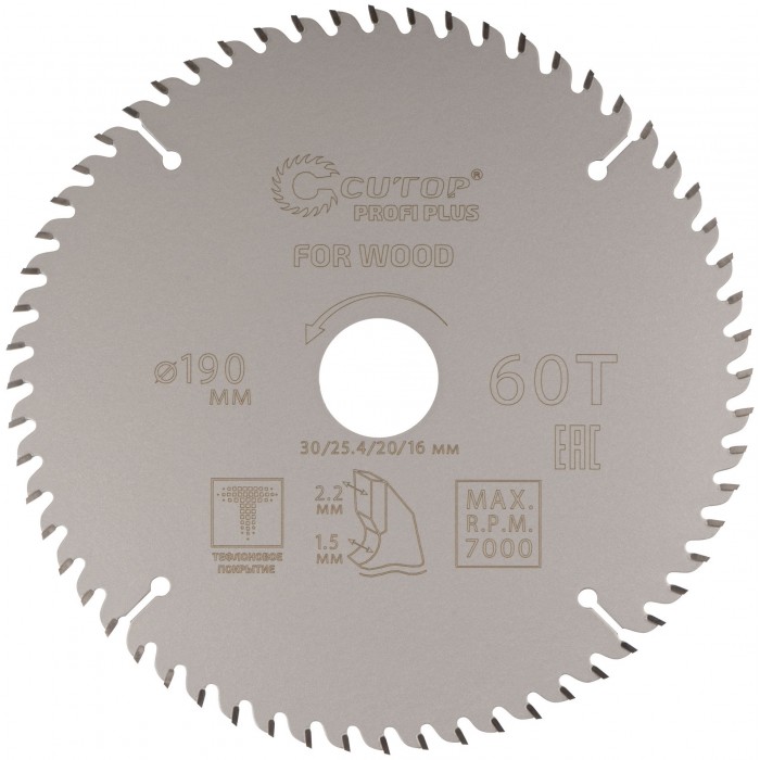 Диск пильный по дереву с тефлоновым покрытием 60Т, CUTOP Profi plus, 190 х 1,5/2,2 х 30/25,4/20/16 мм (75-19060Т)