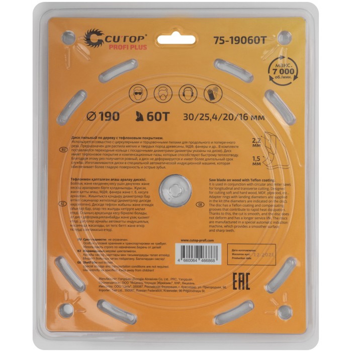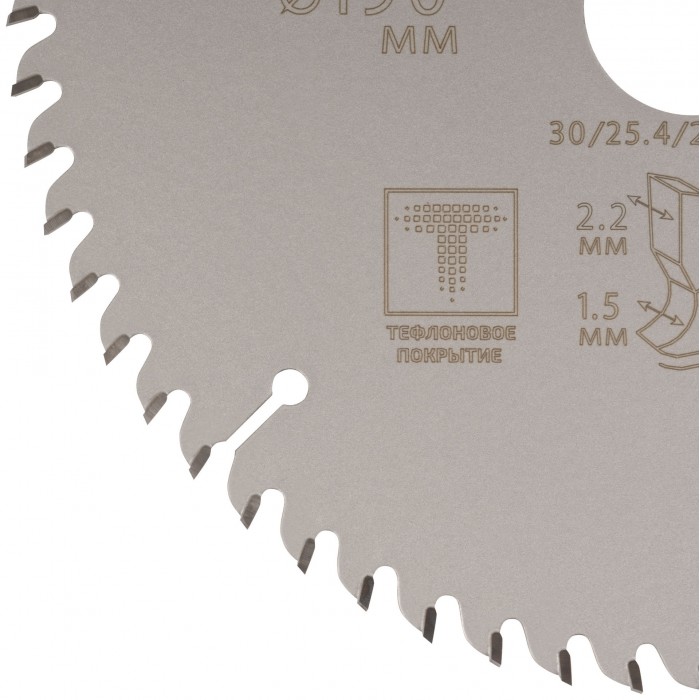 Диск имеет тефлоновое покрытие и компенсационные пазы, которы способствуют быстрому теплоотводу. Благодаря этому рез получается ровный, а диск не деформируется и имеет более длительный срок службы. Изготавливаются диски в специальной автоматической индукционной машине, которая обеспечивает более гладкую поверхность и острые зубья. Материал: инструментальная сталь, карбидные зубья. Упаковка: блистер.
