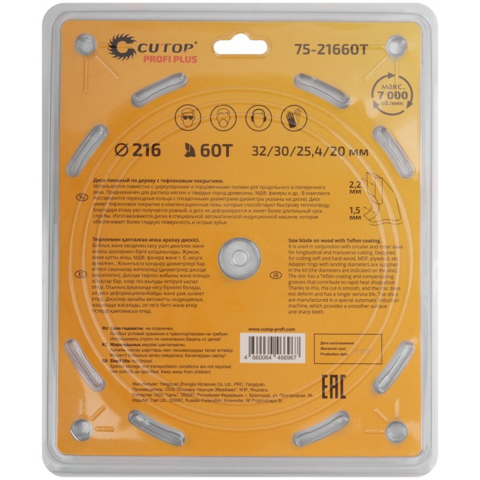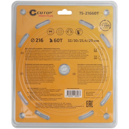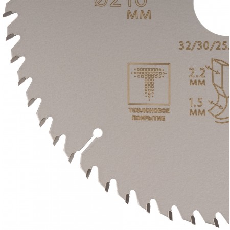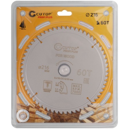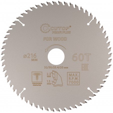 Диск пильный по дереву с тефлоновым покрытием 60Т, CUTOP Profi plus, 216 х 1,5/2,2 х 32/30/25,4/20 мм (75-21660Т)