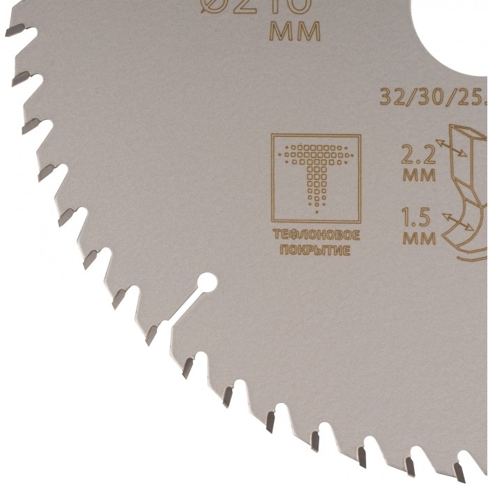 Диск имеет тефлоновое покрытие и компенсационные пазы, которы способствуют быстрому теплоотводу. Благодаря этому рез получается ровный, а диск не деформируется и имеет более длительный срок службы. Изготавливаются диски в специальной автоматической индукционной машине, которая обеспечивает более гладкую поверхность и острые зубья. Материал: инструментальная сталь, карбидные зубья. Упаковка: блистер.