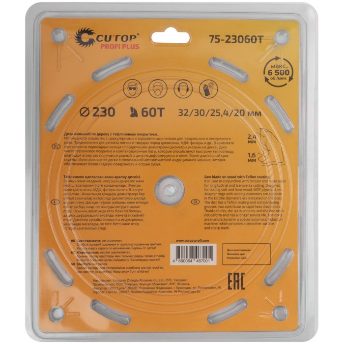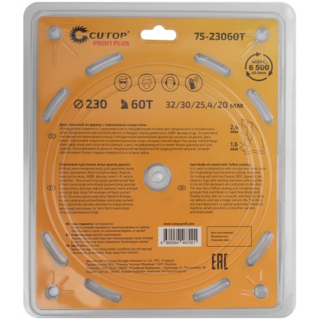 Диск имеет тефлоновое покрытие и компенсационные пазы, которы способствуют быстрому теплоотводу. Благодаря этому рез получается ровный, а диск не деформируется и имеет более длительный срок службы. Изготавливаются диски в специальной автоматической индукционной машине, которая обеспечивает более гладкую поверхность и острые зубья. Материал: инструментальная сталь, карбидные зубья. Упаковка: блистер.
