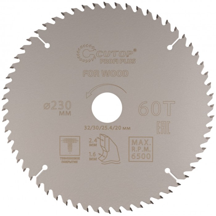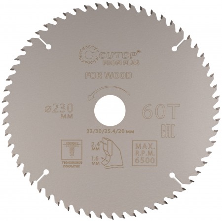 Диск пильный по дереву с тефлоновым покрытием 60Т, CUTOP Profi plus, 230 х 1,6/2,4 х 32/30/25,4/20 мм (75-23060Т)