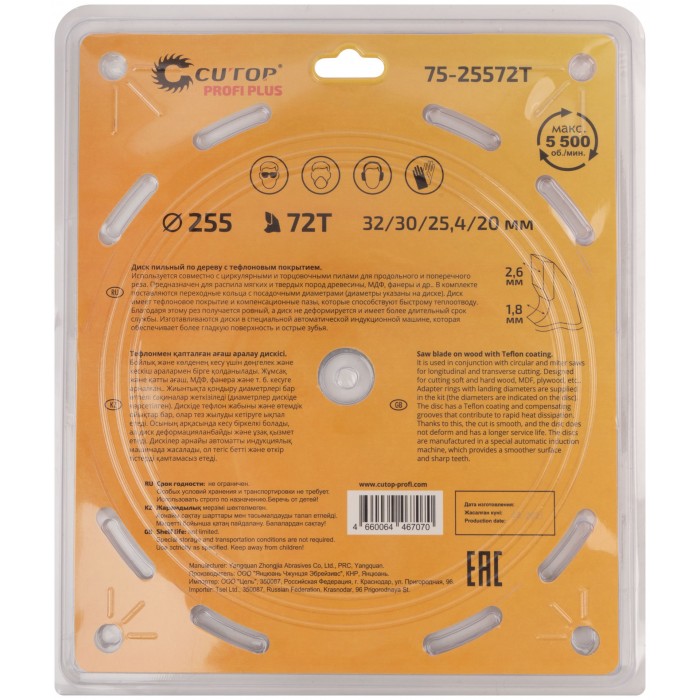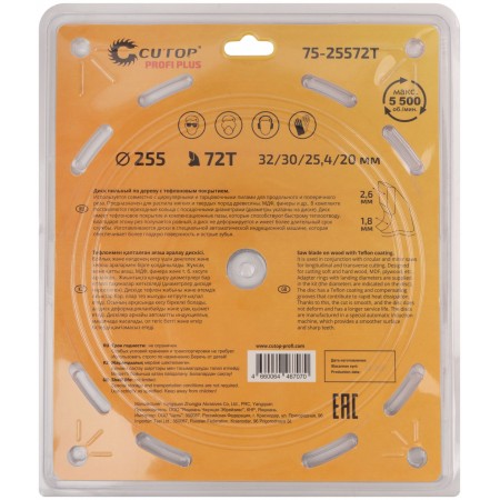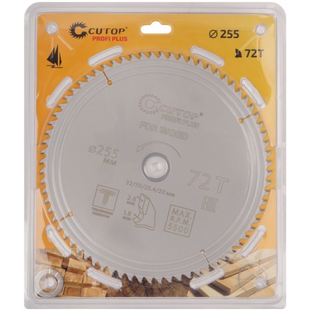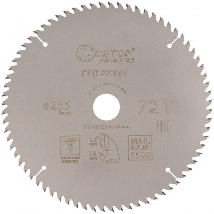 Диск пильный по дереву с тефлоновым покрытием 72Т, CUTOP Profi plus, 255 х 1,8/2,6 х 32/30/25,4/20 мм (75-25572Т)