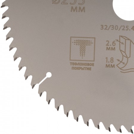 Диск имеет тефлоновое покрытие и компенсационные пазы, которы способствуют быстрому теплоотводу. Благодаря этому рез получается ровный, а диск не деформируется и имеет более длительный срок службы. Изготавливаются диски в специальной автоматической индукционной машине, которая обеспечивает более гладкую поверхность и острые зубья. Материал: инструментальная сталь, карбидные зубья. Упаковка: блистер.