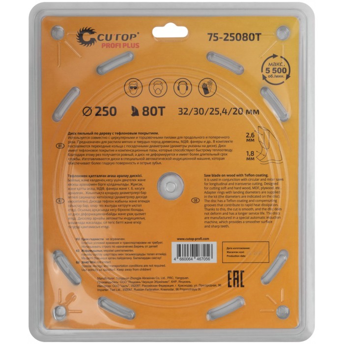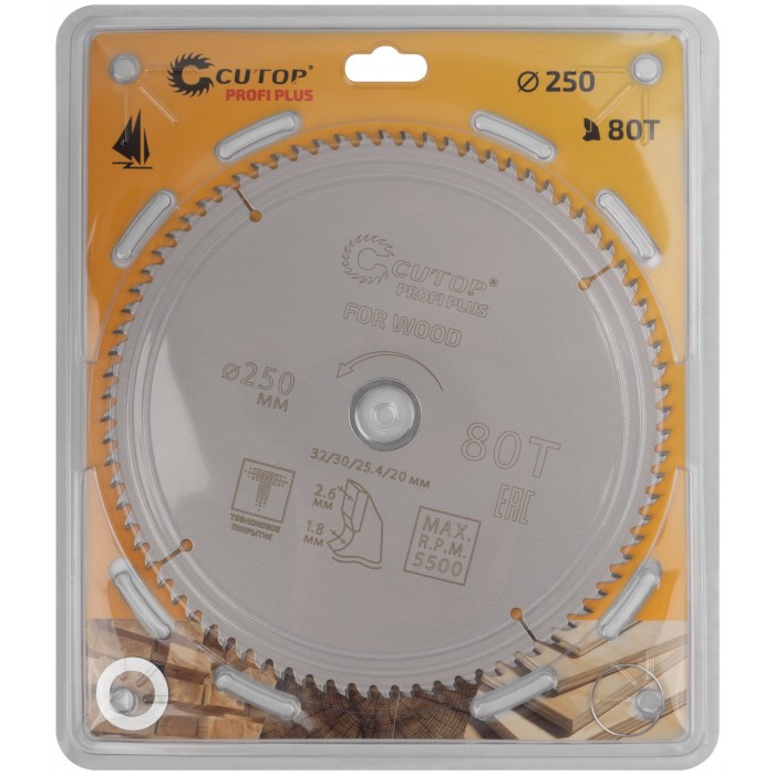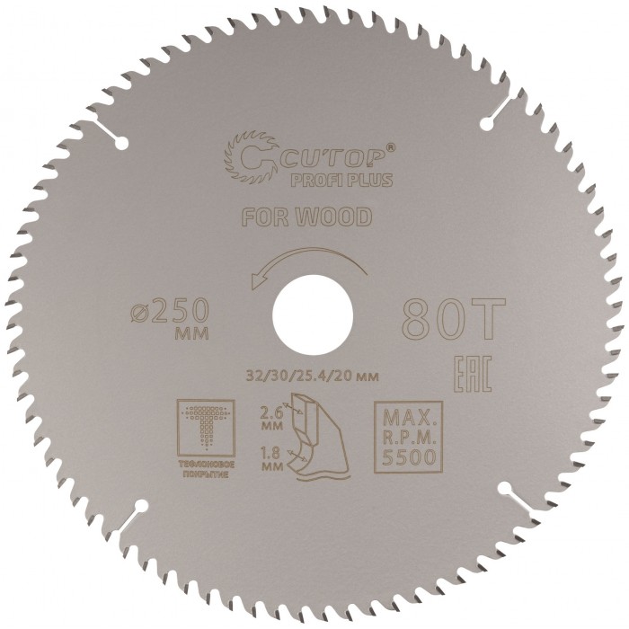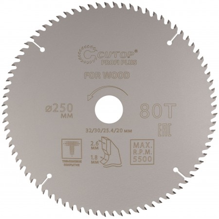 Диск пильный по дереву с тефлоновым покрытием 80Т, CUTOP Profi plus, 250 х 1,8/2,6 х 32/30/25,4/20 мм (75-25080Т)