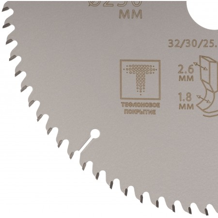 Диск имеет тефлоновое покрытие и компенсационные пазы, которы способствуют быстрому теплоотводу. Благодаря этому рез получается ровный, а диск не деформируется и имеет более длительный срок службы. Изготавливаются диски в специальной автоматической индукционной машине, которая обеспечивает более гладкую поверхность и острые зубья. Материал: инструментальная сталь, карбидные зубья. Упаковка: блистер.