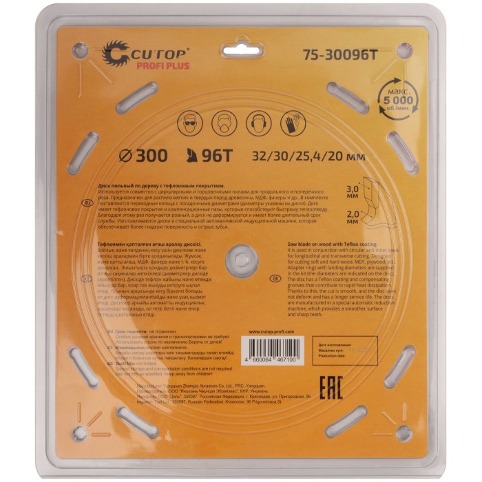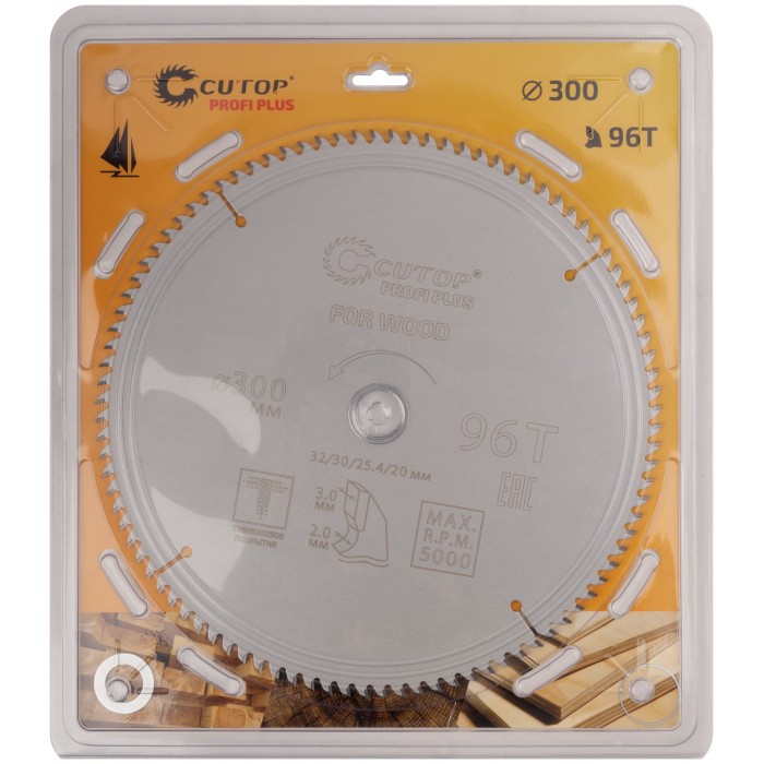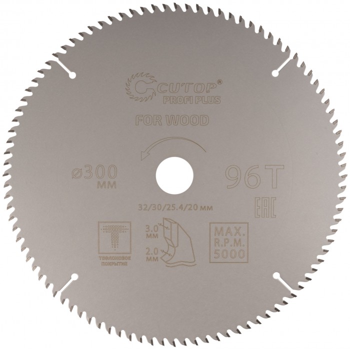 Диск пильный по дереву с тефлоновым покрытием 96Т, CUTOP Profi plus, 300 х 2,0/3,0 х 32/30/25,4/20 мм (75-30096Т)