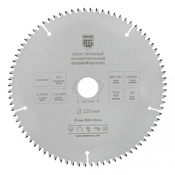 Диск пильный универсальный мультирез (250x32/30/25.4/20x80z, 3.2/2.2 мм, TCG 45°, атака -5°) BERGER BG1668