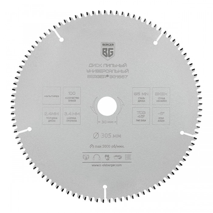 Диск пильный универсальный мультирез (305x30/25.4/20/16x100z, 3.4/2.4 мм, TCG 45°, атака -5°) BERGER BG1667