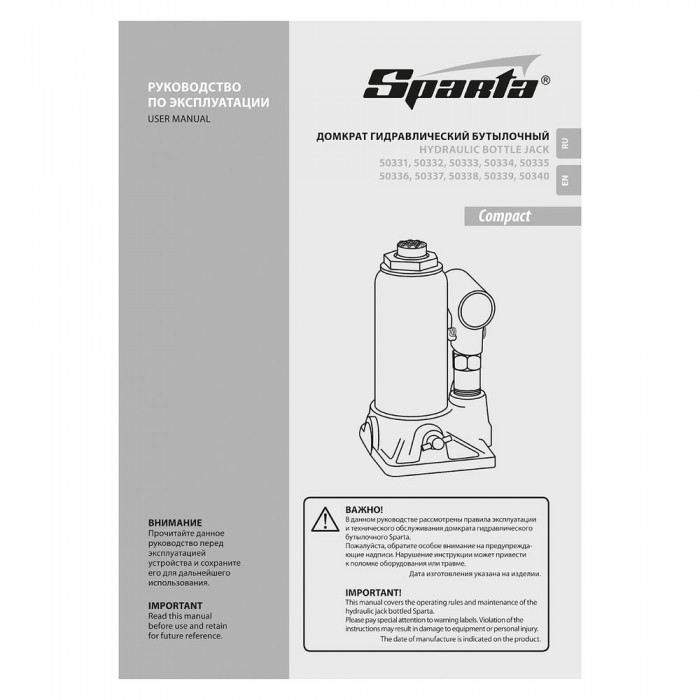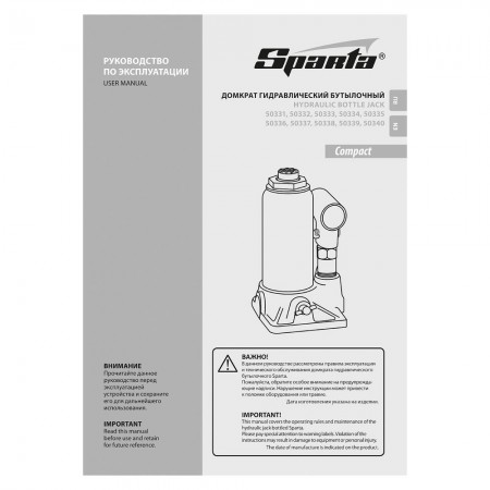 Домкрат гидравлический бутылочный 5 т, h подъема 180-340 мм Sparta Compact