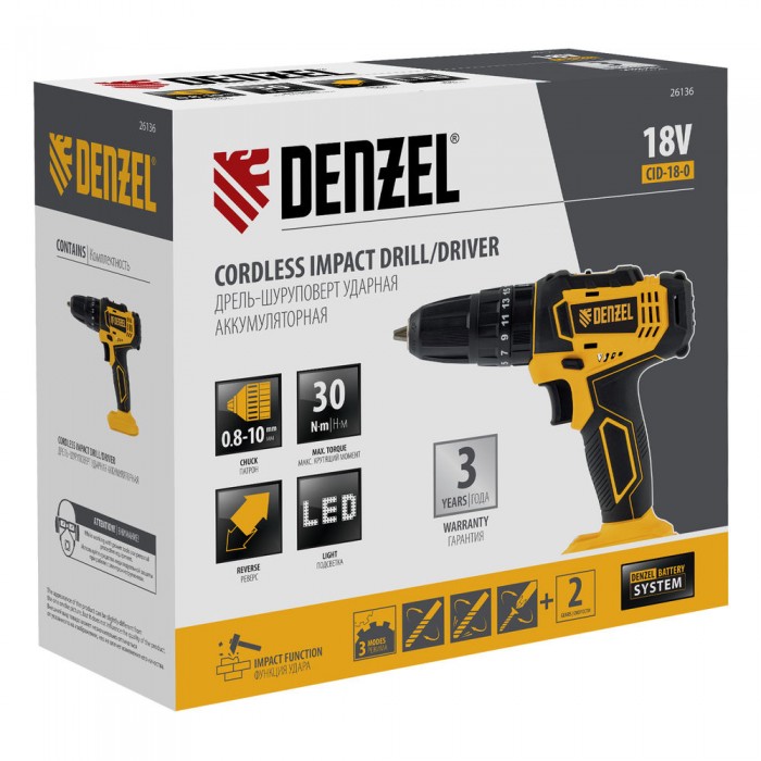 Дрель-шуруповерт аккумуляторная ударная CID-18-0, Li-Ion, 18 В Denzel (26136)