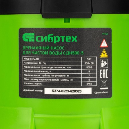 Дренажный насос для чистой воды СДН500-5, 500 Вт, напор 8 м, 8000 л/ч Сибртех (97262)
