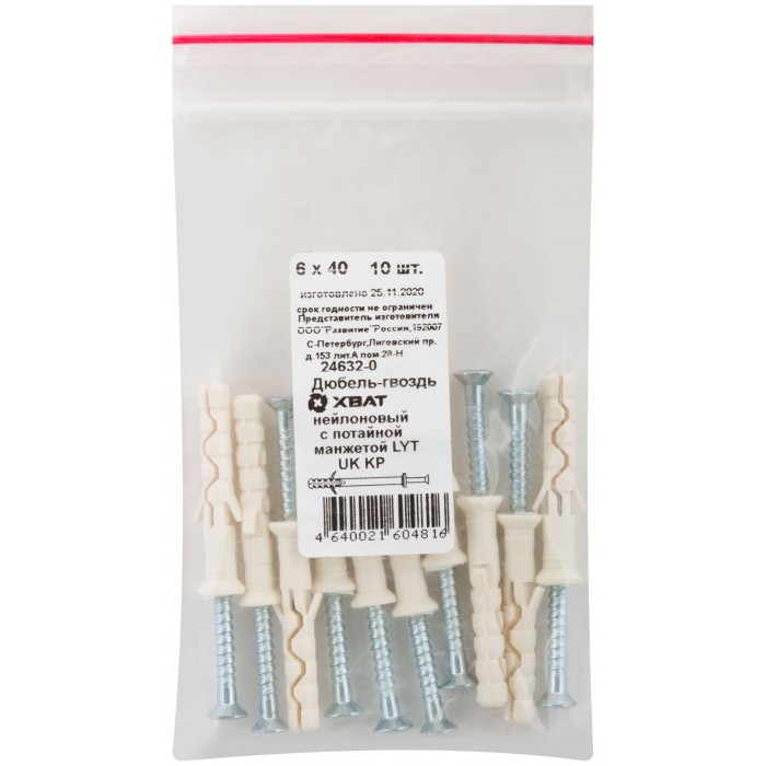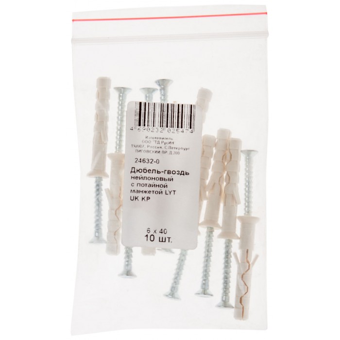 Дюбель-гвоздь нейлоновый с потайной манжетой LYT 6 х 40 UK KP, 10 шт. Фасовка (24632-0)