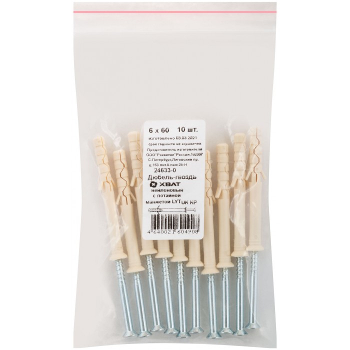 Дюбель-гвоздь нейлоновый с потайной манжетой LYT 6 х 60 UK KP, 10 шт. Фасовка (24633-0)