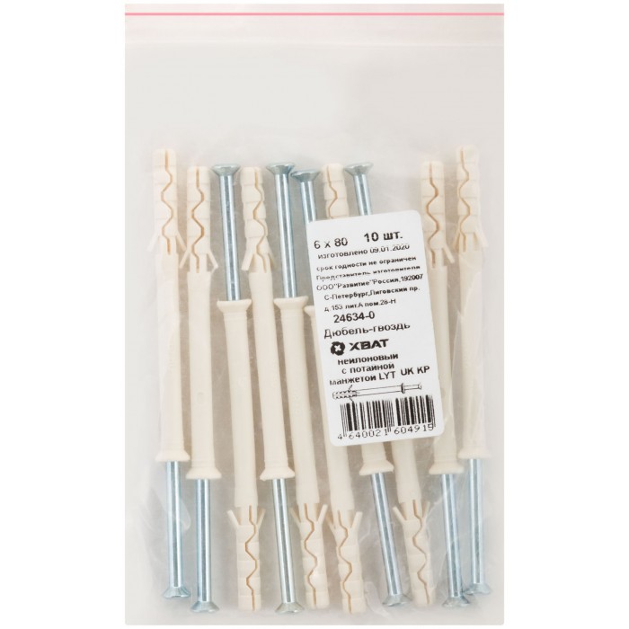 Дюбель-гвоздь нейлоновый с потайной манжетой LYT UK KP 6 х 80, 10 шт Фасовка (24634-0)