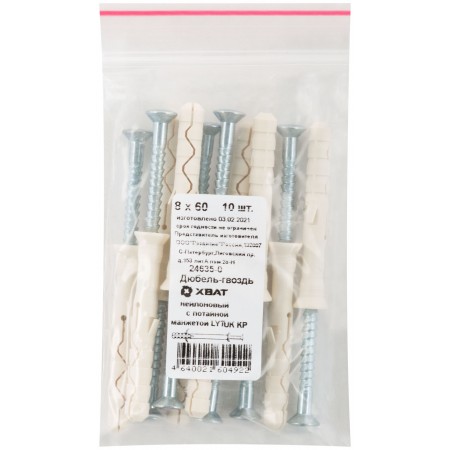 Дюбель-гвоздь нейлоновый с потайной манжетой LYT UK KP 8 х 60, 10 шт Фасовка (24635-0)