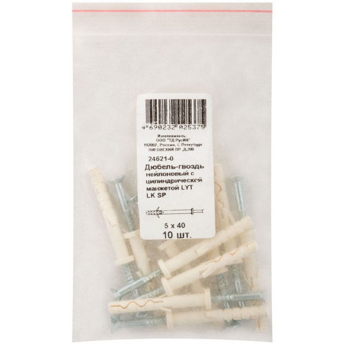 Дюбель-гвоздь нейлоновый с цилиндрической манжетой LYT LK SP 5 х 40, 10 шт. Фасовка (24621-0)