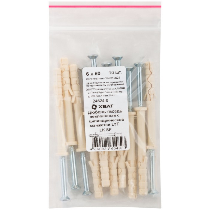 Дюбель-гвоздь нейлоновый с цилиндрической манжетой LYT LK SP 6 х 60, 10 шт (Фасовка) (24624-0)
