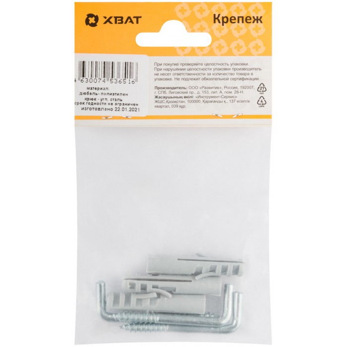 Дюбель изготовлен из полипропилена, шуруп-крюк - из стали. В комплекте: дюбель, шуруп-крюк.